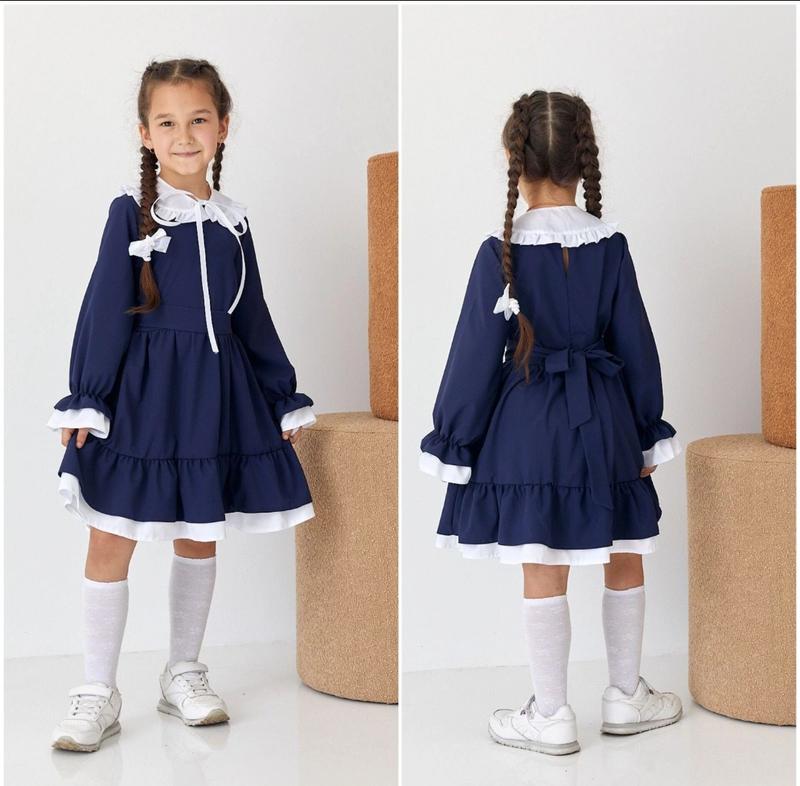 Стильна сукня для дівчат. Гарний варіант в школу! Воротнічок зйомний. Поясок в комплекті. Тканина - супер софт Колір - темно-синій! Заміри: разом з білим оздобленням. 116 довжина від плеча - 62см, напівобхват грудей - 31см, рукав від горловини - 46см. 128 довжина від плеча - 67см, напівобхват грудей - 34см, рукав від горловини - 50см. 134 довжина від плеча - 69см, напівобхват грудей - 35см, рукав від горловини - 53см. 140 довжина від плеча - 72см, напівобхват грудей - 36см, рукав від горловини - 55см Мс