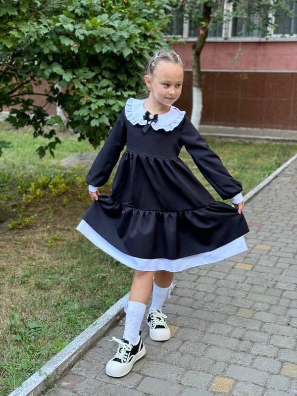 Сукня арт. sev. 870 Розміри: 128, 134, 140, 146, 152 (зріст дитини) Тканина: креп костюмний Туреччина Кольори: чорний і синій Стильна шкільна сукня з білим мереживним комірцем виготовлена ​​з костюмної тканини Завдяки розкльошеному фасону відмінно сидить на худеньких дівчатках і на дівчатках з формами. Брошка-бантик +50 грн