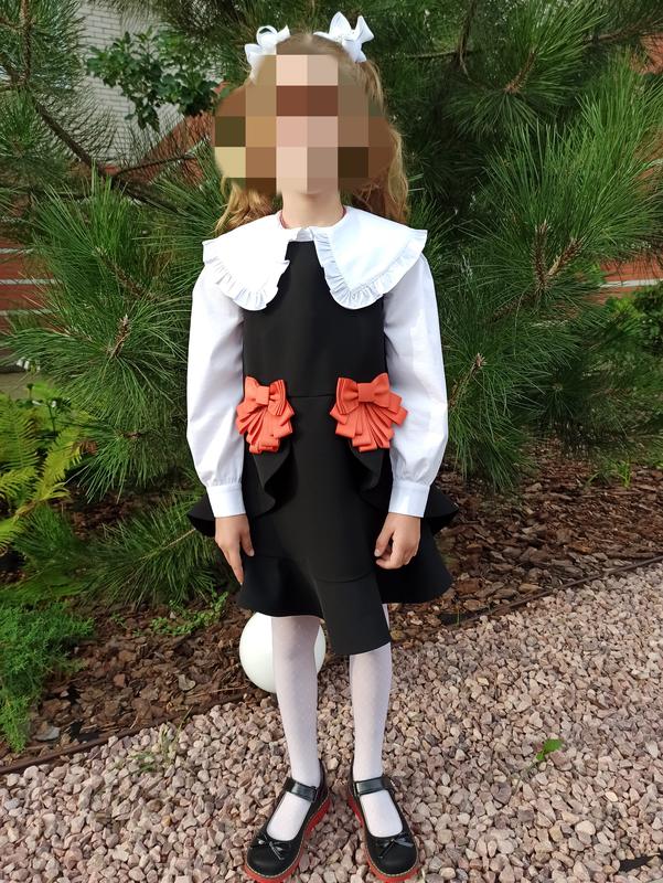 Сарафан/платье, размер 122. Изысканный образ для первого школьного праздника! Отличное платье со сьемным воротничком. Очаровательно смотрится как с ним, так и без него. Двойные воланы которые отлично держат форму, очаровательные бантики привлекают внимание. Ткань: вискоза/полиэстер. Цупка, не мнеться! Сарафан в очень красивом состоянии, одевали всего несколько раз.