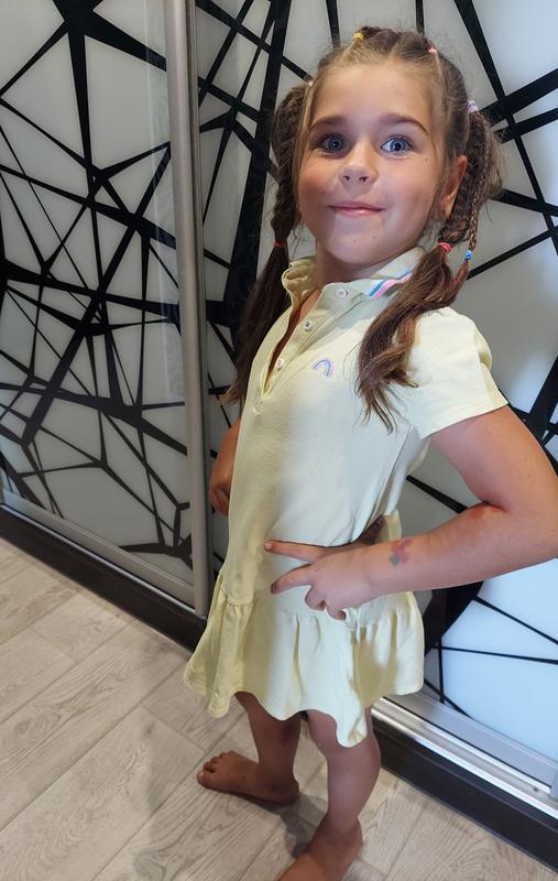Лимонное платье с воротничком от M&S. Состояние идеальное. Ткань 100% коттон. На бирке 5-6 лет, можно с 4 лет. Дочери на фото шесть с половиной лет, и платье уже коротковато.