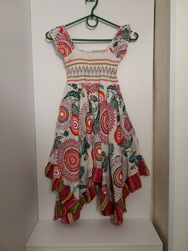 Сукня має яскравий та неповторний малюнок. Різної довжини спідниця додає об'єму та цікавості форми. Є резинки на рукавах та талії; під'юник білого кольору та прямого крою (2 фото). Склад: 100% бавовна. Написано, що для 10 років, але краще дивитися по замірам: довжина по спині - 85 см, півобхват грудей - 27 см, півобхват талії - 20 см (розтягується резинка до 35 см). Для додаткової інформації/фото - пишіть