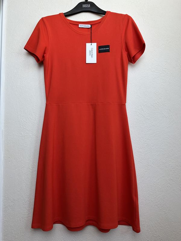 Сукня з колекції Calvin Klein Jeans виготовлена з еластичного трикотажу. Модель із надзвичайно комфортного матеріалу з високим вмістом віскози. - Виготовлено із LENZING™ ECOVERO™ - екологічно чистого матеріалу. При виробництві LENZING™ ECOVERO™ з органічної целюлози та деревної маси використовується на 50% менше води, ніж популярна віскоза. - Розкльошений фасон. - Класичний круглий виріз. - Короткий рукав. Склад: 70% віскоза 26% нейлон 4% еластан Зріст: 170 см, 16 років Сукня красивого насиченого кольору, фото на шафі не передає