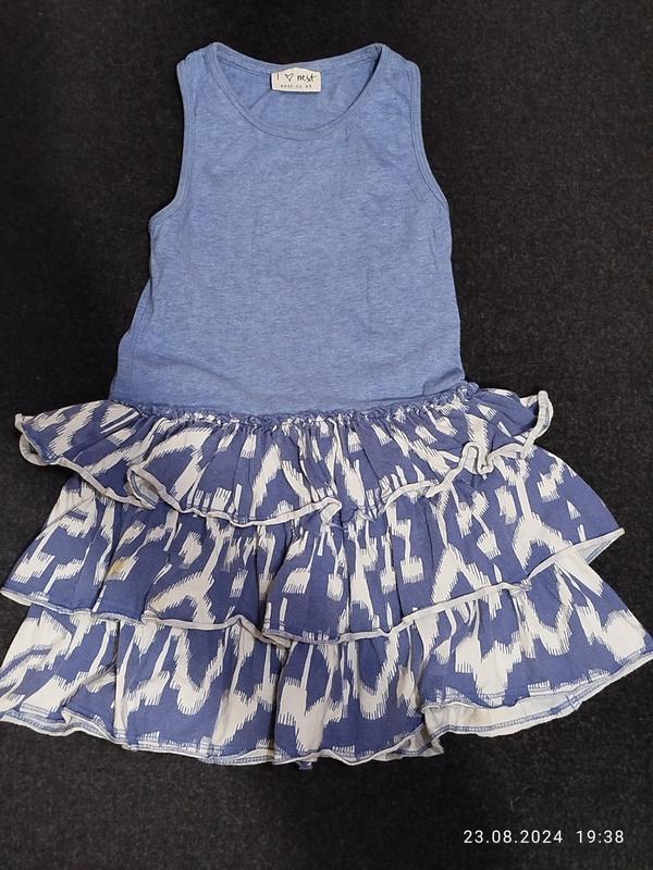 Мінімальне замовлення у продавця на 100 грн. Симпатичне легке плаття next на дитину 5 років у дуже гарному стані, є невелике цяточки. Плаття світло-синього кольору. Довжина виробу по спинці від плеча 58 см, напівобхват грудей 27 см, напівобхват талії 28 см. Тканина бавовна тягнеться. Модель 4593Т