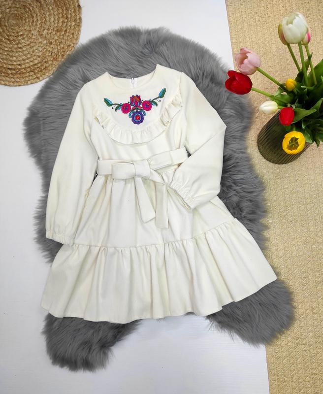 В наличии 🧡 Невероятно красивое платье с вышивкой тканина вельвет манжети на резинці,поясок в комплекті замеры: длина/рукав от плеча/погрудей 110-63/39/28 116-67/42/29 122-69/45/30 128-72/47/31 +-2см