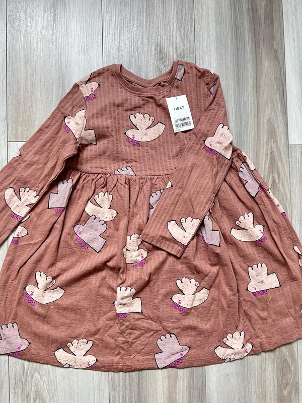 Трикотажна сукня на довгий рукав для дівчинки коричневого кольору. Зроблена з тканини в рубчик і має принт з пташками Склад: 100% бавовна