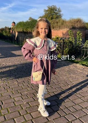 Фіолетово-бузкова сукня із трендовим комірчиком. Сукня із натуральної тканини, доступна у розмірах на вік 3,4,5,6,7,8, років. Також маєм туфлі, сумочку, колготи, гетри.
