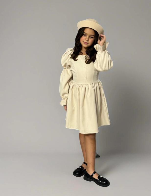 Стильна сукня для модниць Гудзики по переду - декоративні. Тканина- костюмна. Колір - бежевий. Заміри: 140 довжина - 73см, напівобхват грудей - 36см, рукав - 56см. 152 довжина - 83см, напівобхват грудей - 41см, рукав - 61см. 158 довжина - 87см, напівобхват грудей - 43см, рукав - 64см. * на плотних дівчат Мс