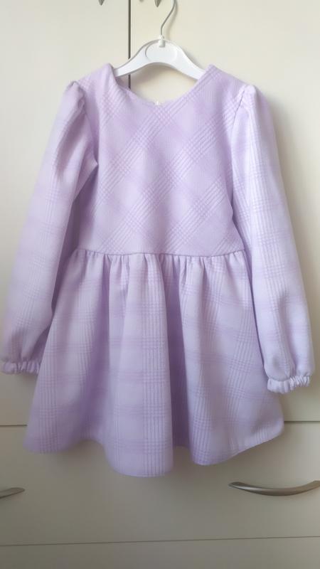 Плаття для дівчинки 3-4 роки. По бірці 104 розмір, але краще орієнтуватися на заміри: довжина від плеча 51см, рукав 38см, півОГ -27см. Ззаду зв'язується. Тканина тепла. Колір ніжний бузковий.