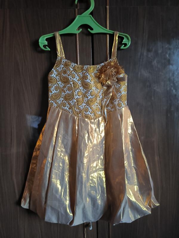 Нарядна сукня для дівчини 7-8 рочків, зріст 122-128 см. Нова. Не вдягали зовсім. Хендмейд. Укоаїна. Покупали на заказ, але швидко виросли у талії. По бокам косточки корсетні, На спинці - блискавка і шнуровка. на груді є декор - троянда із парчі Склад: підкладка + металізована парча + натуральний жакард з золотою вишивкою "огірки". Верх - корсет, низ - спідниця по типу "балон", з підогнутим низом. Заміри: пог 30/32 см, пот 30/31 см, Довжина віід плечіків до низу 70 см.