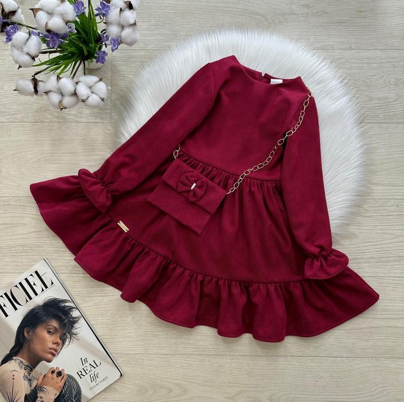 Стильна неймовірна сукня 🎀🌸🎀 Пишна спідниця 😍 В комплекті сумочка 👛 Позаду застібка ґудзик 👌🏻В рукавичках резиночка ☺️ Тканина: замш діагональ 💓 Виробник: Україна 🇺🇦 ЗАМІРИ +/-1-2см!!! ▪р.104- довжина сукні від плеча 57см/ рукав від плечового шва 39см / ПОГ 28см/ довжина спідниці 34см ▪р.110- довжина сукні від плеча 62см/ рукав від плечового шва 41см / ПОГ 29см/ довжина спідниці 36см ▪р.116- довжина сукні від плеча 64см/ рукав від плечового шва 42см / ПОГ 30см/ довжина спідниці 38см ▪р.122- довжина сукні від плеча 67см/ рукав від плечового шва 44см / ПОГ 31см/ довжина спідниці 40см