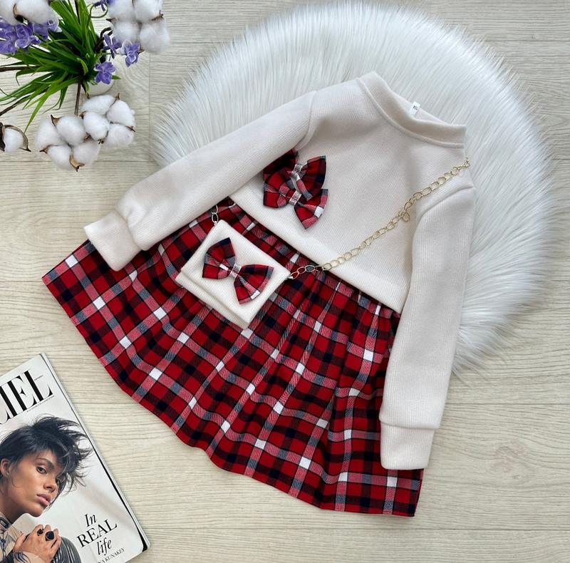 Стильова тепленька сукня для красунь 🎀😍🎀 Верх мʼякенька вʼязка🥰 Спідничка в трендову клітинку 😍 В комплекті сумочка 👛 Позаду регулюється пояском👌🏻 Тканина: верх- вʼязка/ спідниця- турецька клітинка💓 Виробник: Україна 🇺🇦 ЗАМІРИ +/-1-2см!!! ▫️р.110- довжина від плеча 57см/рукав від плечевого шва 38см /ПОГ 30см/ довжина спідниці 33см ▫️р.128- довжина від плеча 66см/рукав від плечевого шва 43см /ПОГ 33см/ довжина спідниці 39см