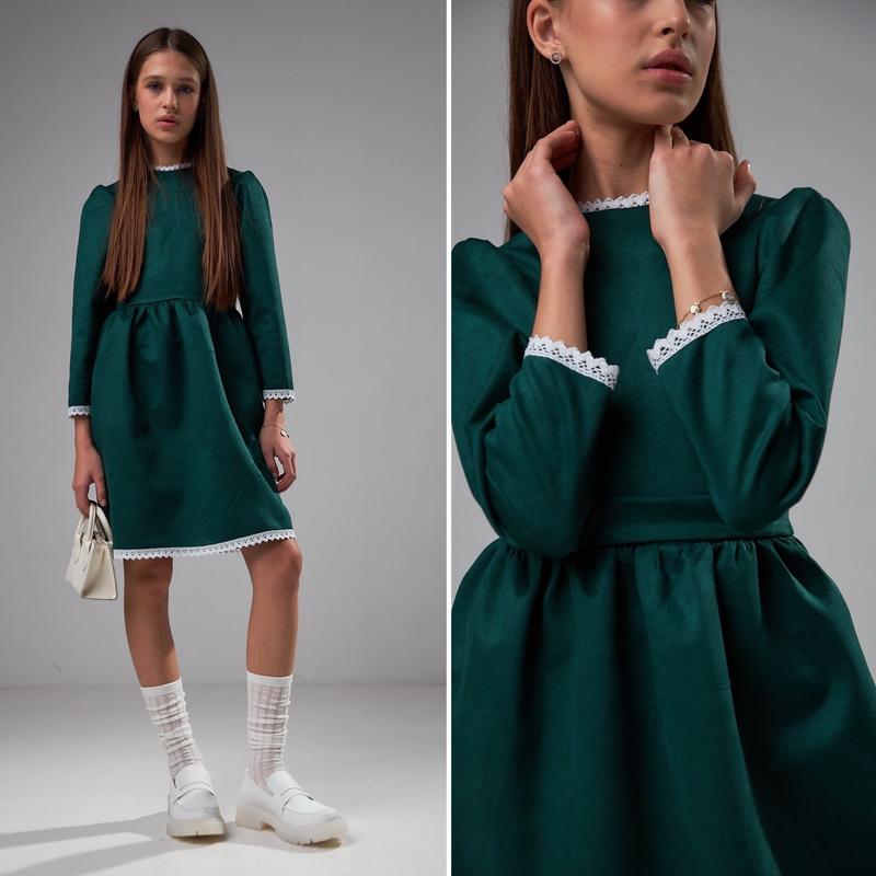 Красивое и нежное платье Ткань замш, приятная к телу Украшена кружевом Под поясок КАЧЕСТВО ЧУДОВА!! РЕКОМЕНДУЮ!!! 134-1шт 140-1шт 146-1шт 152-1шт 158-1шт Длина/пог/рукав 134-70/31/41 140-72/32/42 146-75/33/44 152-77/35/45 158-80/37/47