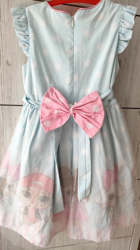 Стильна літня сукня для дівчинки в хорошому стані. Ніжно-блакитний колір з принтом ляльок LOL. Серед дефектів - невеличка Аляска під фатином (видно на останньому фото)