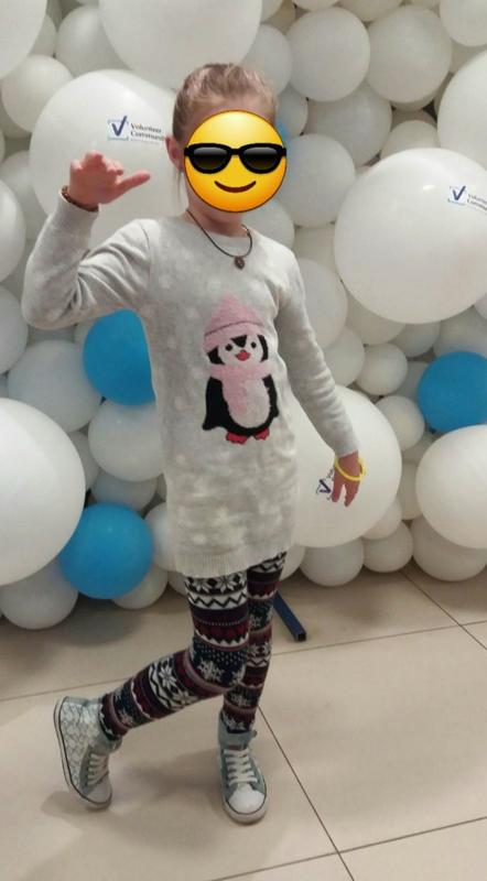 Трикотажне плаття/туніка Young Dimension світло-сірого кольору з білими сніжинками. З аплікацією пінгвіна. Склад - 67 % коттон, 26 % поліестер. Більше підійде на худеньку дівчинку за рахунок того, що в'язка щільна- двохстороння. Вказані розміри: 5-6/116. Заміри: довжина 60 см. ПОГ 32 см. В талії 31 см. по низу плаття 33 см. рукав 41 см. Стан відмінний. нюансів немає. Перешлю.
