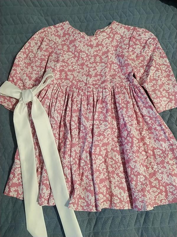 ніжна сукня з поясом на дівчинку. Маломірить, вказаний розмір 116, по факту на 104-110. Довжина по спинці 52, пів обхват талії 30, рукав від шва 28