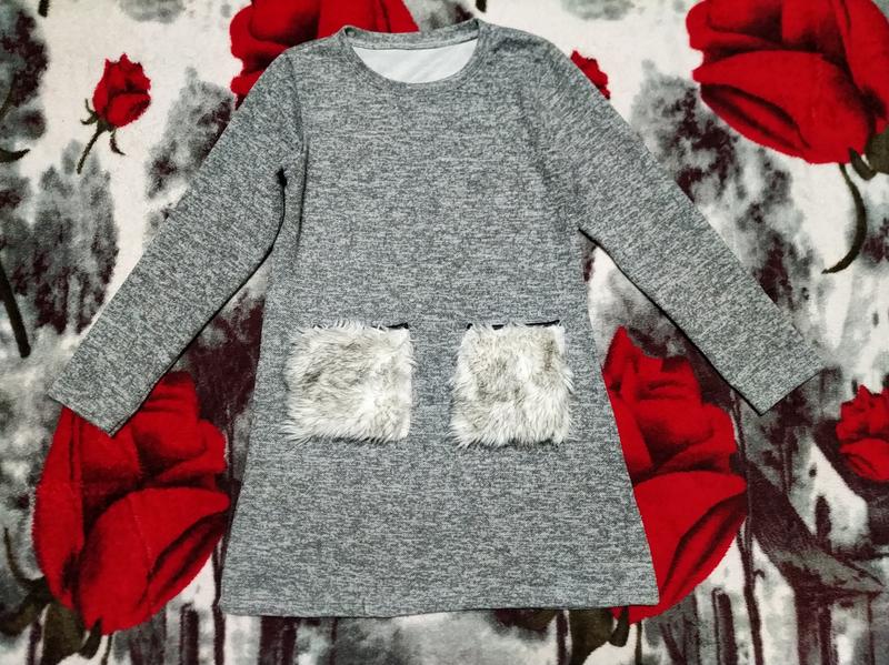 Теплое,стильное платье, платье с меховыми кишнями для девочки 9-10 р в отличном состоянии. Длина-68 см, под ручками-40 см,рукав от плеча-49 см