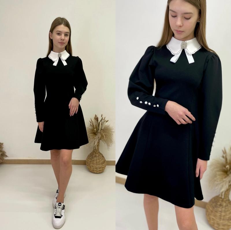 арт 5908 Сукня "Перлинка" тканина Алекс має помірний стрейч за рахунок незвичайного рукава прикрашеним гудзиками,та коміру який додає сукні вишуканності та елегантності ,сукня стає святковою і в той самий час дуже зручною у використанні,на будь який випадок Комір зʼємний прикрашений брошкою зріст/довжина/пог/рукав від плеча 140-146/70/30/45-2шт 146-152/73/31/47-3шт 158-164/80/33/53-1шт Тан