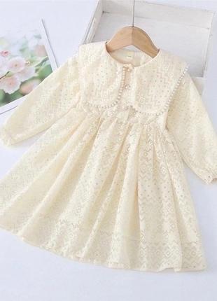 Неймовірно стильна та нарядна мереживна сукня 🔥 Знизу на бавовняній підкладці Дуже гарно сидить на дитині Дуже гарні ґудзики 😍 Комірець з усіх сторін прикрашений перлинами ⚪️😍 110 - довжина 59 см, шир 27 см, рукав 36 см 130 - довжина 68 см, шир 30 см, рукав 42 см Замір рукава від плеча Арт нс