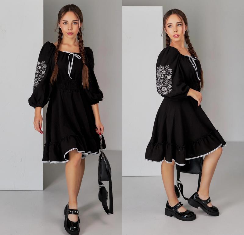 арт 5400 Сукня муслінова із вишитими рукави оздоблено мереживом та асемитричним низом в талії під резинку Тканина-муслін Зріст/довжина/пог/рукав від горловини похибка+-2см 140-146/77/41/41-3шт Тан