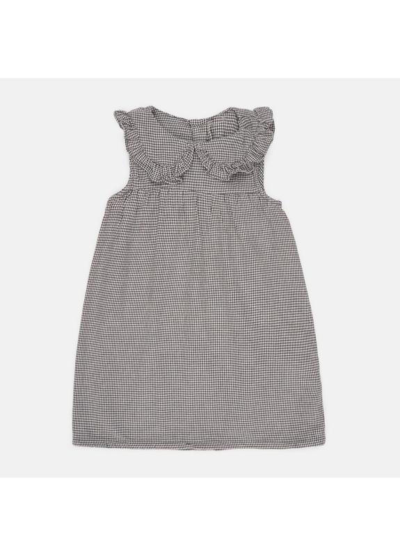 Можливе пошкодження бирки Плаття з твілу без рукавів, з великим коміром із рюшами, ґудзиками на шиї та призбираним швом зверху. 1164786_гус.лап.беж.ґудз