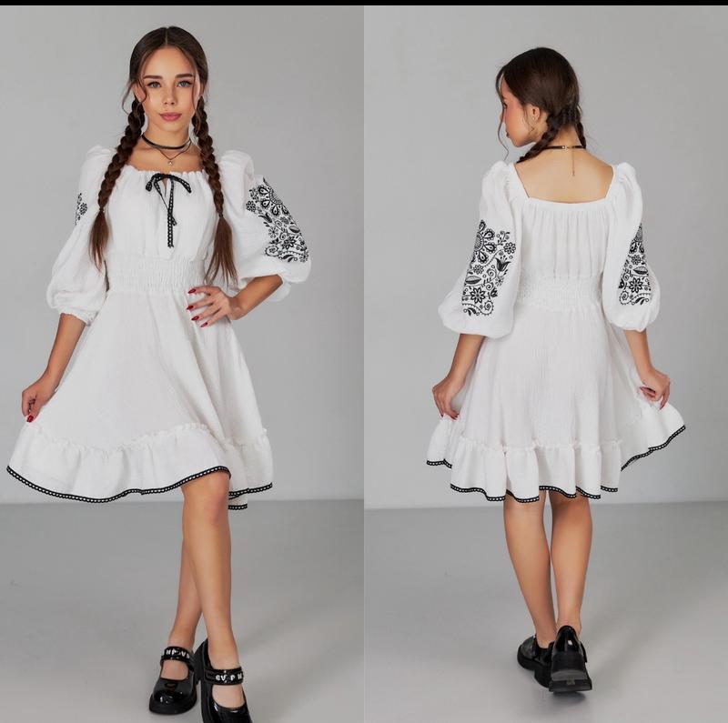арт 5401 Сукня муслінова із вишитими рукави оздоблено мереживом та асемитричним низом в талії під резинку Тканина-муслін Зріст/довжина/пог/рукав від горловини похибка+-2см 140-146/77/41/41-1шт Тан