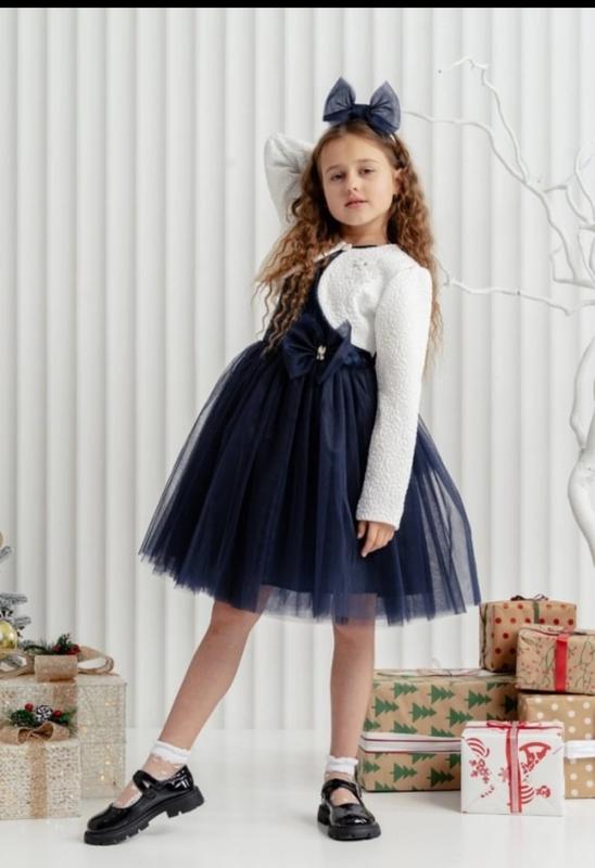 Вишукана сукня з болеро та обручем. Прекрасний варіант для свята! Сукня з пишною спідницею та бантом позаду. Болеро застібається на ґудзик. Обруч з бантиком. Тканина: сукня мереживо+ фатин з підкладкою, болеро - французький трикотаж. Заміри: 116 сукня довжина - 68см, напівобхват грудей - 30см. болеро довжина - 21см, руав - 42см. 122 сукня довжина - 71см, напівобхват грудей - 33см. болеро довжина - 23см, руав - 45см. 128 сукня довжина - 76см, напівобхват грудей - 35см. болеро довжина - 24см, руав - 46см. Мс