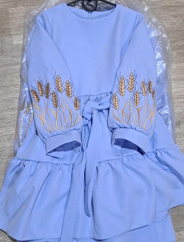 Невероятно красивое и нежное платье На рукавах ВИШИВКА!, не малюнок. По спинке застегивается на молнию. Пояс в комплекті. Ткань - костюмка барби. Замеры: 146 длина-77см, полуобхват груди - 37см, рукав - 53см. Мс