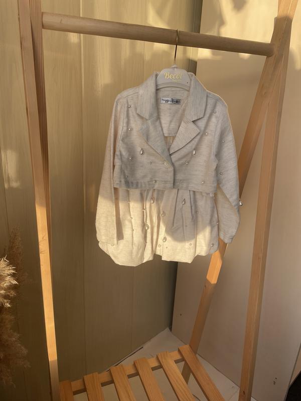 Дуже красивий костюм, беж, всі перлини прошиті нічого не відпаде., вигляд неймовірний. Стан ідеальний ( трішки є катишки на рукавах ) на фото спробувала передати .
