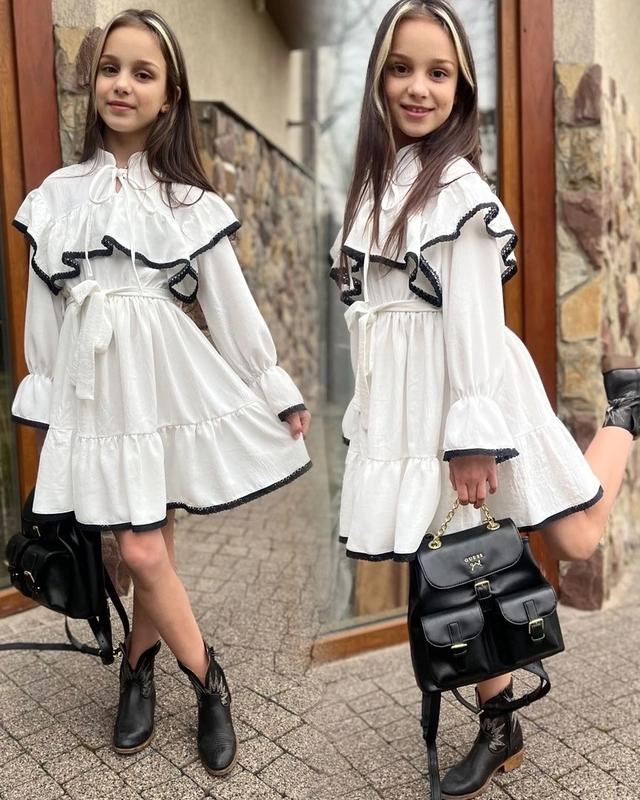 Необычайно красивое платье Ткань: креп-жатка,высокого качества и кружево Талия под резинку,пояс снимается Размеры: 128см 2шт 134см 2шт 140см 2шт 146см 2шт 152см 1шт Замеры: +-2см допустимая погрешность Рукав от плеча/длина платья/пог 128 - 46/69/30 134 - 48/73/31 140 - 50/76/32 146 - 52/79/33 152 - 54/81/34