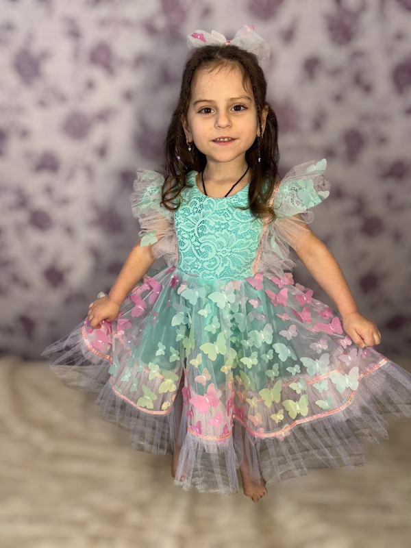 Нежное платье с бабочками. Ткань 3Д сетка. Верх атлас с крупом. Ріст модельки 96 см. На голову великий бант. В наличии. На возраст 1-4 года. Замеры : ВП - 20 см НТ - 28 см ДС - 36 см Бренд Altun Post . Шьём по вашим меркам