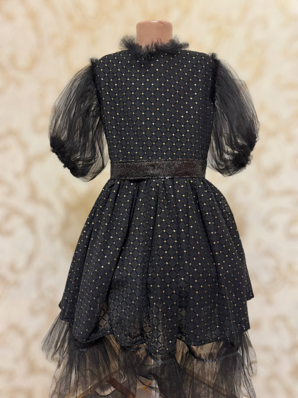Мила сукня в чорному кольорі. Трикотажна сітка з глітерними стразами( золото). Знизу фатин. В наявності. На ріст 150 см Виміри: Від плеча до талії - 38 см. Напівобхват талії - 36 см. Довжина спідниці - 52 см.