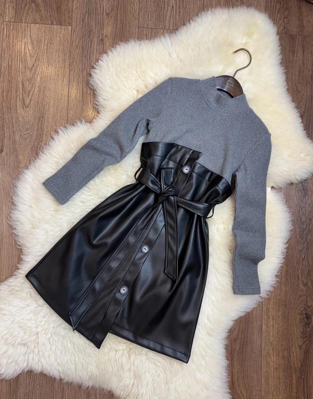 Стильна тепла сукня для красунь 💗 тканина ангора в рубчик + еко шкіра на замші зав'язується під поясок, прикрашена гудзиками Заміри: довжина/пог/рукав 152 - 76/40/51 158 - 79/42/53 164 - 82/44/55 Ян