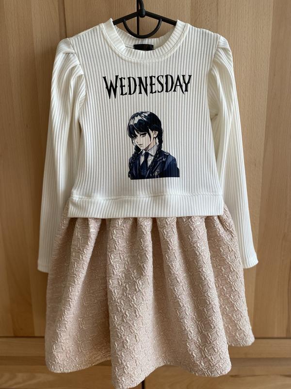Святкова дитяча сукня “Wednesday” Розмір 122-128 Колір верху ( айворі ) Колір низу ( рожево - персиковий ) Довжина рукава від плеча 46 см Пів обхват грудей 28 см Пів обхват талії 29 см Довжина сукні від плеча до низу 65 см Довжина спіднички від талії до низу 33 см Спідничка злегка пишна Рукавчики вверху призбирані Стан ідеальний! Одягали один раз!