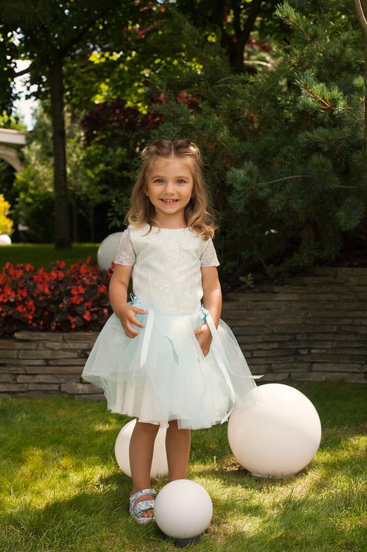 Детское летнее праздничное платье с юбкой-пачкой и коротким рукавом в белом и голубом цветах. Топ расшит бисером и пайетками, пышная короткая юбочка выполнена из фатина. Легкое и в меру пышное платье с легким блеском. Идеальный наряд для любого праздника! Лиф выполнен из мягкой приятной ткани, которая вся переливается тысячами мелких искорок. Юбка выполнена из фатина двойного цвета: мятного и белого. Длина примерно по колено. У лифа – хлопковая подкладка, в этом платье будет очень комфортно. Позади платье застегивается на молнию. Юбочка украшена бантиком. Размер: 26 Возраст: 3