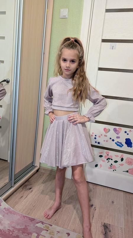 продам костюм в ідеальному стані. топ і спідничка крою "сонце" блищать неймовірно. всередині трикотажна основа спідничка з фатіном і підкладкою. рукав 42 см, спідничка 35 см