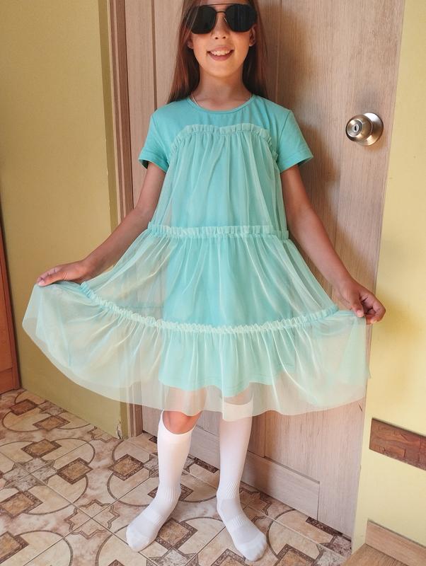 Стильна сукня в кольорі бірюза, низ- м'який трикотаж приємний до тіла, верх -тюль сіточка. Може бути і як повсякденний і як святковий варіант.Ідеальна на весну-літо.