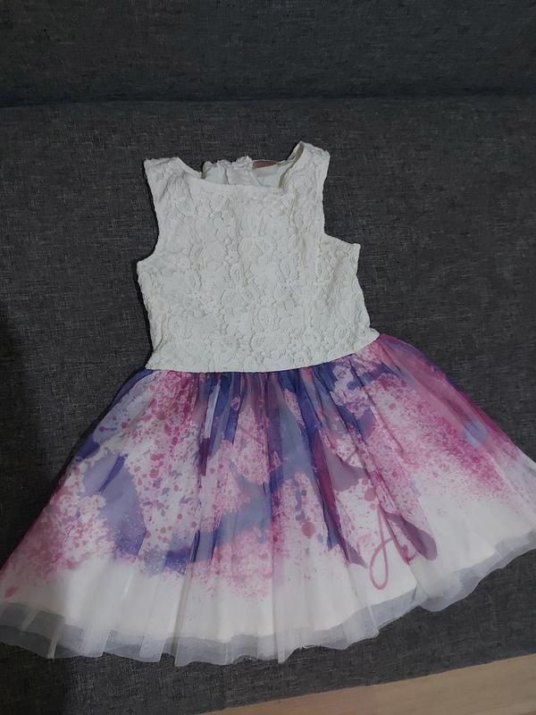 Платье на 6 лет. Кружево молочного цвета, пышная юбочка с принтом. По спинке молния. На среднюю, художную телосложение.