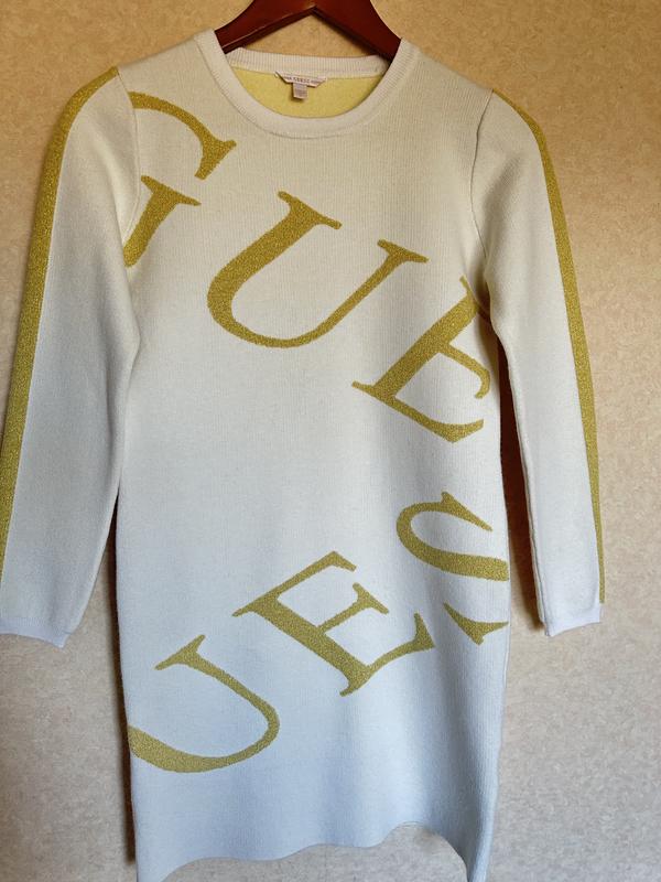 Стильна сукня білого кольору з яскравим принтом (логотипом бренду) -виконаний золотистим люрексом, спинка-біла,на рукавах-люрексові лампаси. Трикотаж достатньо щільний, гарно тримає форму(не буде витягуватись та кошлатитись) в складі:50%~віскоза, 30%~поліестр, 19%~поліамід,1%~металізована нитка; етикетка зі складом взята на офіційному сайті, платтячко наявне в поточній колекції GUESS. Стан ідеальний (практично нове). Розмір 12років ; підійде і на XXS-XS.