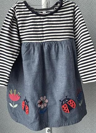 Дуже гарне плаття, як нове. Верх - бавовна, низ легкий джинс з нашивними аплікаціями, на плечах кнопочки. довжина - 43 рукав від плеча - 26 пог - 27, лінія пришиву тягнеться