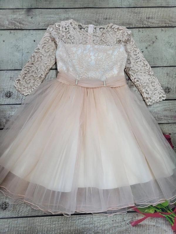 Праздничное платье для девочек По спигке застегивается на молнию. Сзади завязывается на бант. Рукав - 3/4 Ткань - кружево+евросетка+атлас. Цвет-бежевая пудра. Замеры: 140 длина - 84см, полуобхват груди - 35см, рукав от плеча - 41см. 146 длина - 85см, полуобхват груди - 36см, рукав от плеча - 42см. 152 длина - 86см, полуобхват груди - 38см, рукав от плеча - 43см. Размеры в наличии: 140-1шт 146-1шт 152-1шт