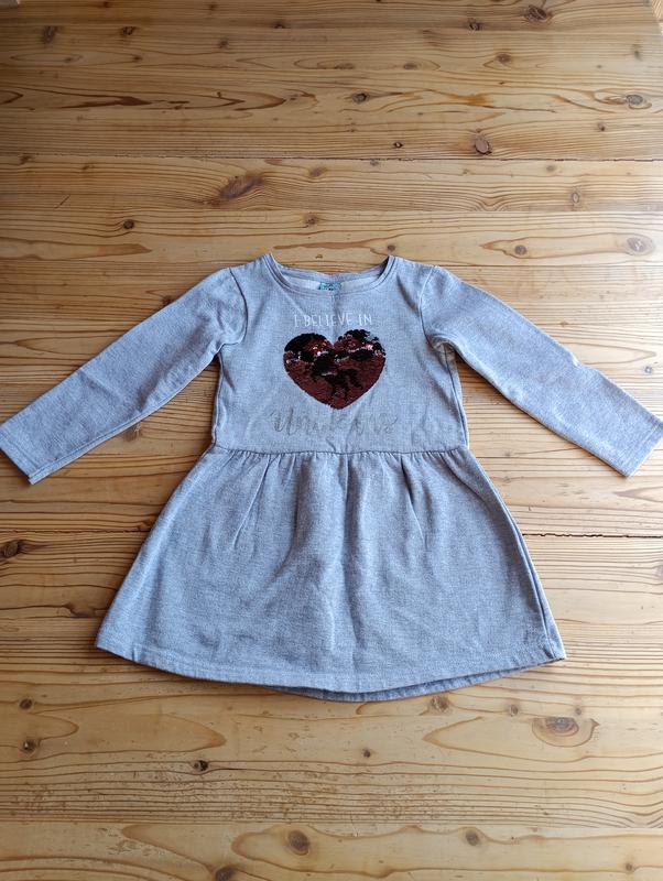 Сіра сукня на дівчинку 6-7 років з сердечком з паєток,з довгим рукавом Заміри:плечі 28 см, довжина рукава 37см,пог 30см, довжина сукні 57 см