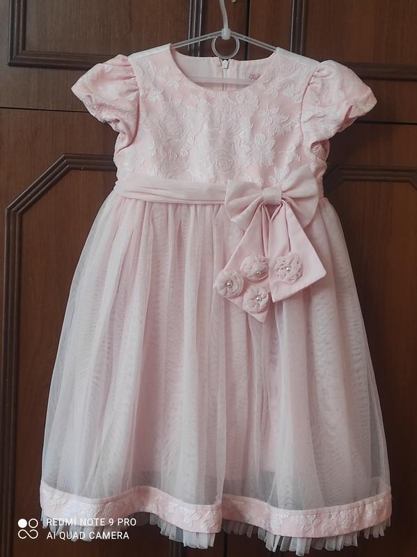 Ніжна ошатна сукня для дівчинки пудровово-рожевого кольру, жакардовий верх на підкладці, спідниця з двох шарів фатину та тканинна підспідниця. Перед сукні декорований гарним поясом з бантом та фатиновимт квітками з рожевими перлинками. позаду ширина ліфа регулюється зав'язками з органзи ПОГ 34 ПОТ 32 Довжина 68