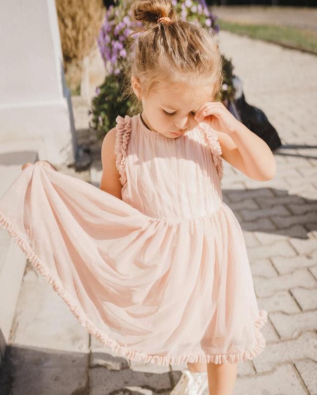 Нарядна святкова сукня Next для дівчинки, колір рожева пудра, у ідеальному стані. Розмір на етикетці 98 см, на вік 2 3 роки. Підійде також на 92 98 104 см. Довжина 61 см Під пахвами 27 В поясі 28 см