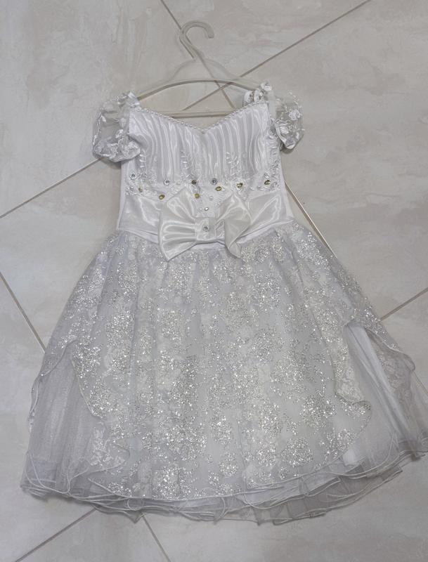 Дуже гарна святкова сукня! Стан - ідеальний! Спідниця прикрашена квітковим принтом з блискітками, рукавчик- воланчиком з вишивкою, корсет оздоблений перлинами, стразами та вишивкою, на поясі бантик. Декілька ярусів спідниць. Ззаду змійка та шнурівка для регулювання об'єму. Довжина сукні 60 см, ПО грудей 26 см, ПО талії 28 см. Дуже ніжно виглядає! Ваша дівчинка буде в ній справжньою принцесою!