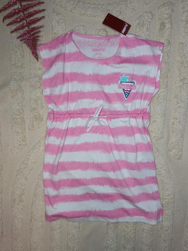 Очень красивое летнее платье в полоску с принтом. Платье легкое, есть утяжка в поясе, будет очень уместно вашей девочке. Цена: 230 грн Размер: 122-128 Тканина: бавовна
