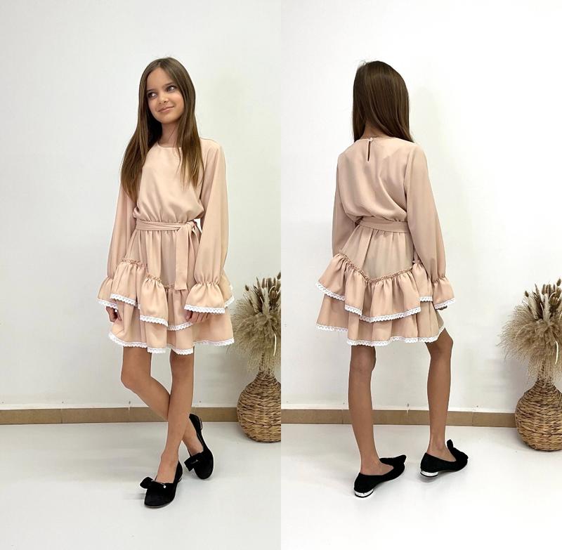 арт 6167 Гарна сукня з пишною спідничкою в талії під резиночку та поясок застібається поспинці на ґудзик Тканина Французький костюмний креп оздоблена бавовняним мереживом ГАРНА ЯКІСТЬ! зріст/довжина/пог/рукав від плеча похибка+-2см 140/71/39/50-1шт 146/74/4053-1шт Тан
