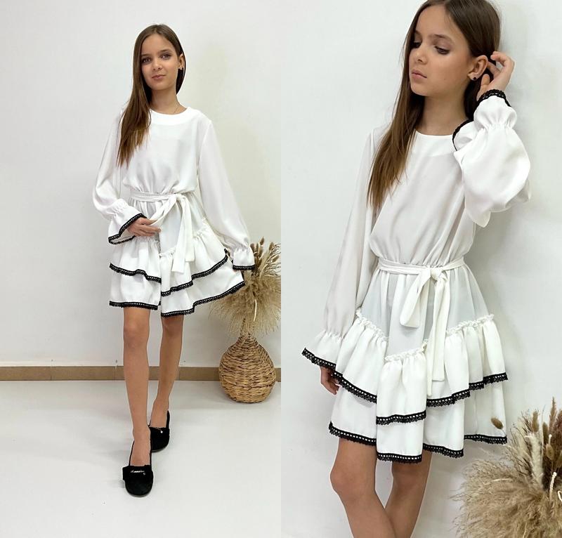арт 6165 Гарна сукня з пишною спідничкою в талії під резиночку та поясок застібається поспинці на ґудзик Тканина Французький костюмний креп оздоблена бавовняним мереживом зріст/довжина/пог/рукав від плеча похибка+-2см 140/71/39/50-1шт 146/74/4053-1шт