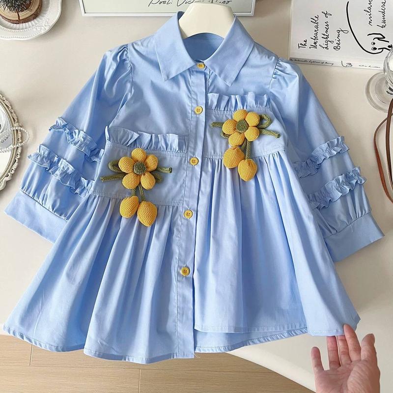 🔹Неймовірна стильна сукня-сорочка. 🔹Рубашечна тканина (бавовняна), не просвічується. 🔹Дуже стильні квітки і в добовнення до них жовті гудзики. 📏📐📝ЗАМІРИ📝📐📏 Рукав від плеча Довжина вказана по коротшій частині. 120 - довжина 58 ширина 34 рукав 38 130 - довжина 63 ширина 36 рукав 42 140 - довжина 68 ширина 38 рукав 45