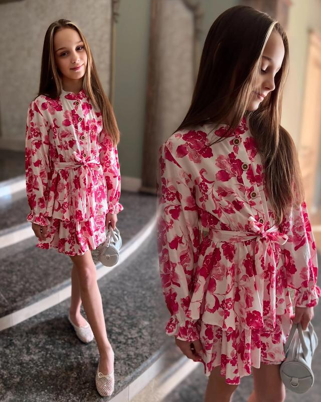 Изящное платье для леди 💖 На пуговицах с двумя оборками нами, поясок снимается Тканина: крем-жатка Размеры: 128 134 140 146 152 Цена:850грн Замеры: длина рукава от плеча/длина/пог 128 - 41/63/31 134 - 44/66/32 140 - 46/68/33 146 - 49/72/34 152 - 52/74/35