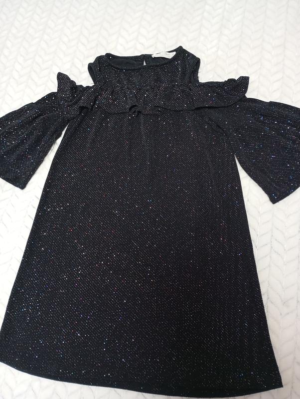 Дуже гарна сукня, з відкритими плечиками, позаду защіпається на ґудзик., тоненька( літня). Прошита блискучими ниточками. вживу дуже гарно виглядає. Довжина 63 см